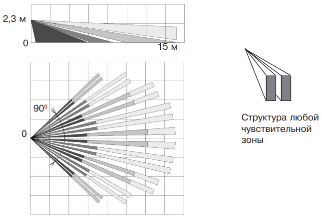 - Объемная зона обнаружения с высокой плотностью заполнения обеспечивает высокую вероятность обнаружения нарушителя.