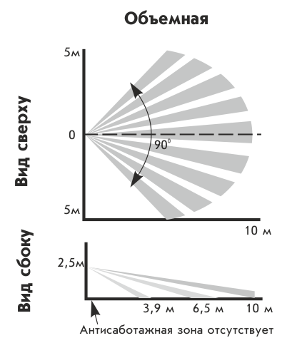 | Угол зоны (Охранные датчики) | 90° объемная |
